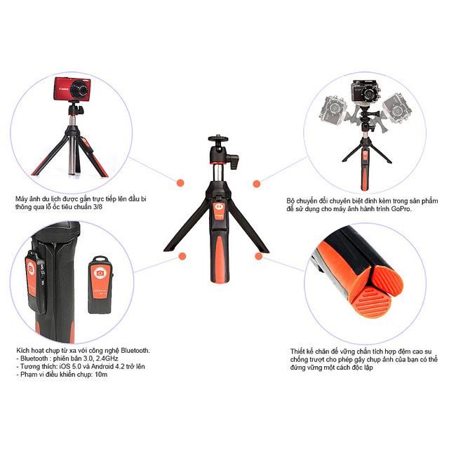 - Phụ kiện thay thể đầy đủ bao gồm: Remote Bluetooth (có bán rời giá 160.000đ), đế kẹp điện thoại MH1 (có bán rời giá 80.000đ), đế gắn camera hành trình Gopro.- Chân được bảo hành 1 năm