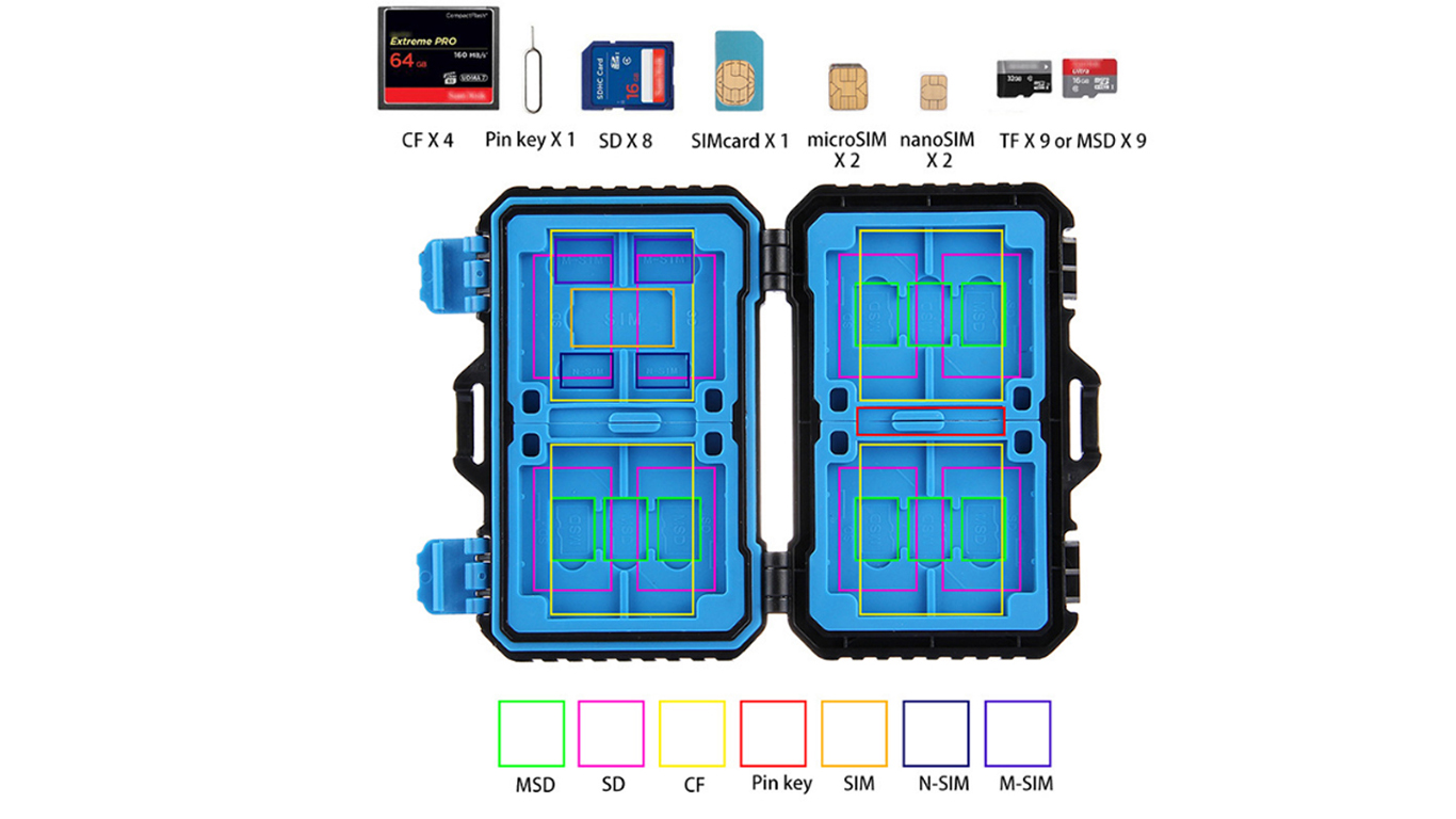 - Đựng được cùng lúc 4 CF + 8 SD + 5 Sim ( 2 Nano Sim + 2 Micro Sim + 1 Sim ) + que chọc sim